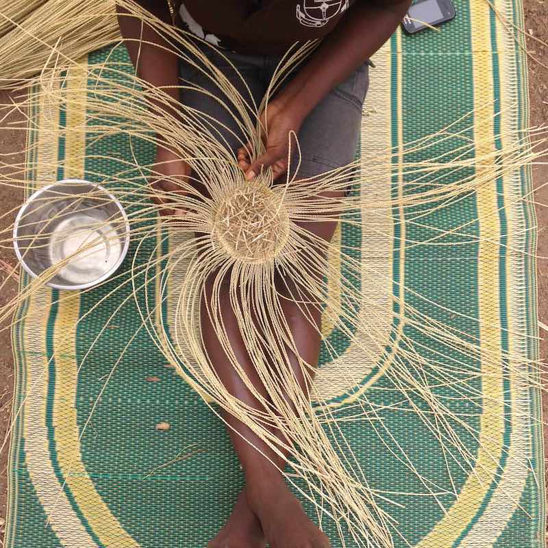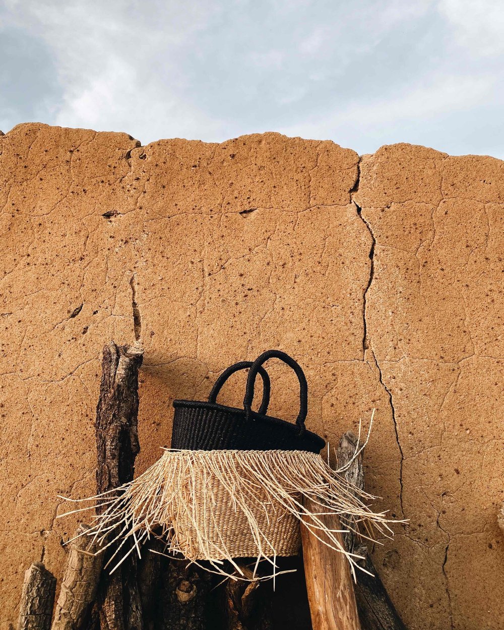 The raffia bags are handcrafted by 50 weavers in Northern Ghana using ecologically harvested raffia from farmers and families in the region. A sophisticated non-chemical dyeing process is formulated to create bright exuberant colors. It takes approximately one week to complete a handbag with an unwavering dedication to modern style using traditional methods. Made by hand, each bag bears the fingerprints of the person who fashioned it and a signature tag is added to prove authenticity.
