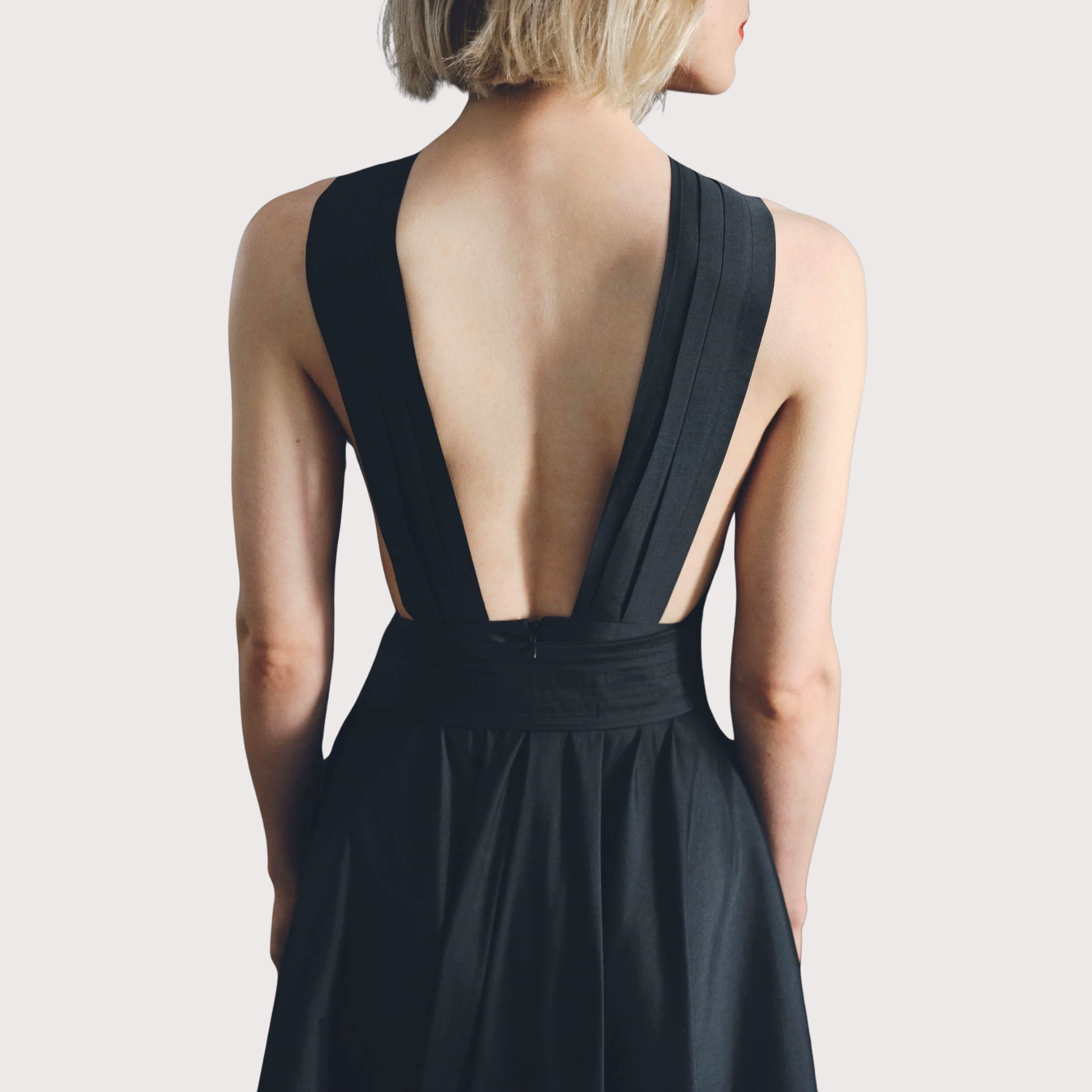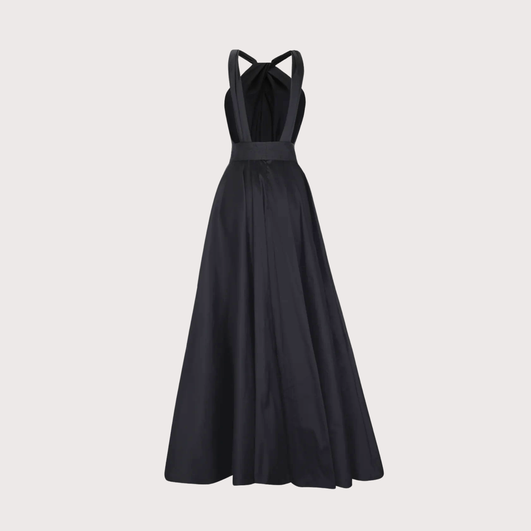 Powerful and elegant in this A-line pleated maxi dress with chest eyelet and halter neckline that goes down the back as two parallel wide strings. Features hidden pockets, a waistband, and a front bow, crafted in timeless black taffeta.