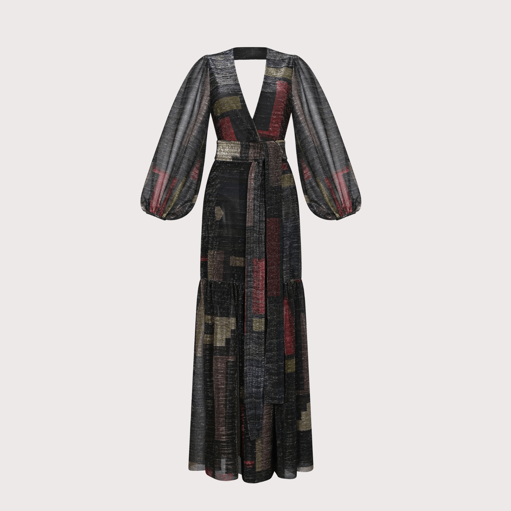 The Huari Maxi Dress Features a deep V Neckline, Balloon Sleeves, and a softly tiered skirt in metallic tulle. Its flowing shape is balanced by a matching belt that cinches the waist. Now in Balkanicas bold Huarihaus print - rich in colour, subtle in shine.