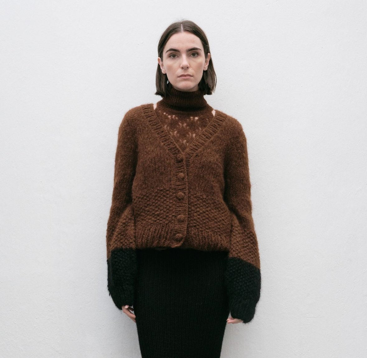 The Yana Cardigan is a V-neck cardigan with color contrast puff sleeves.