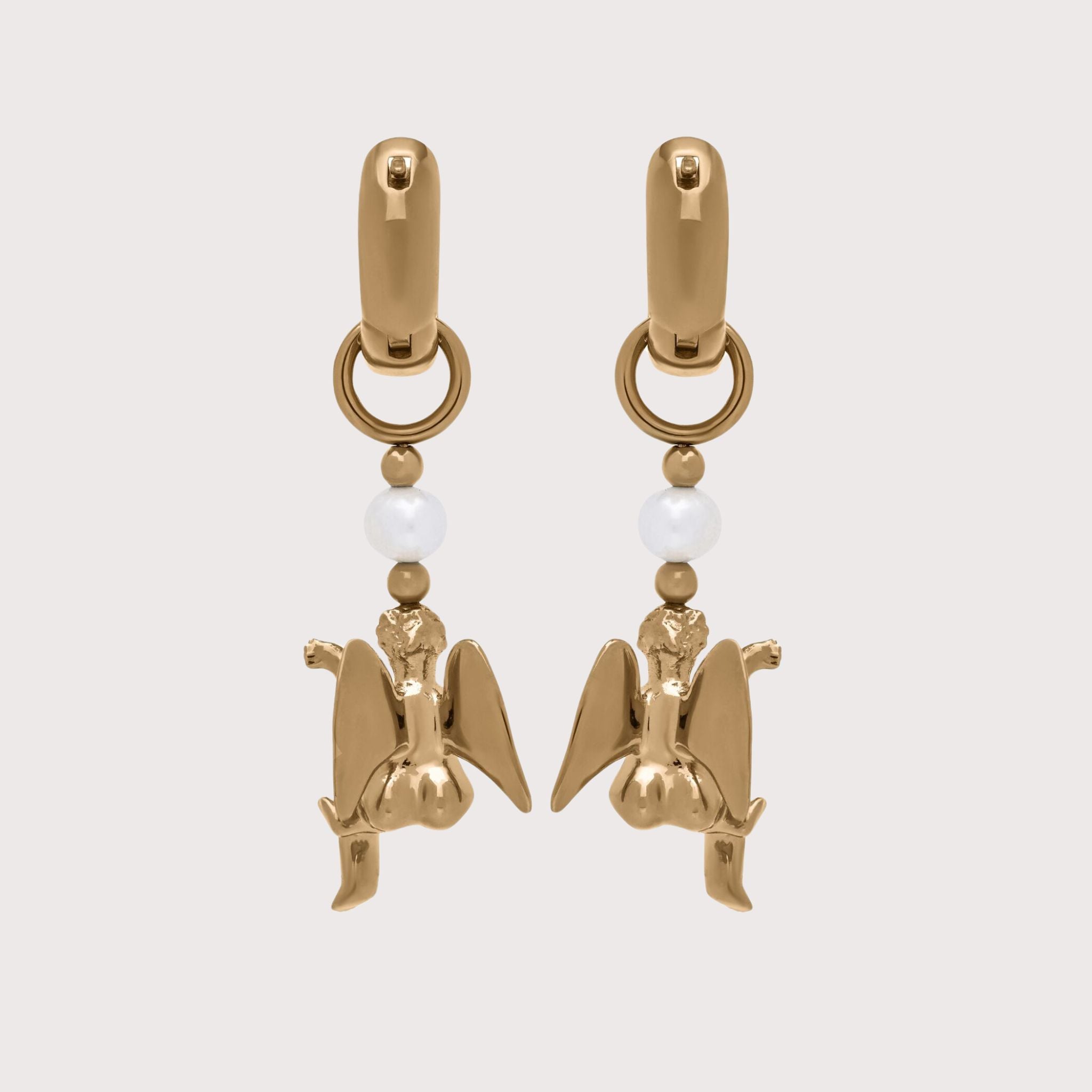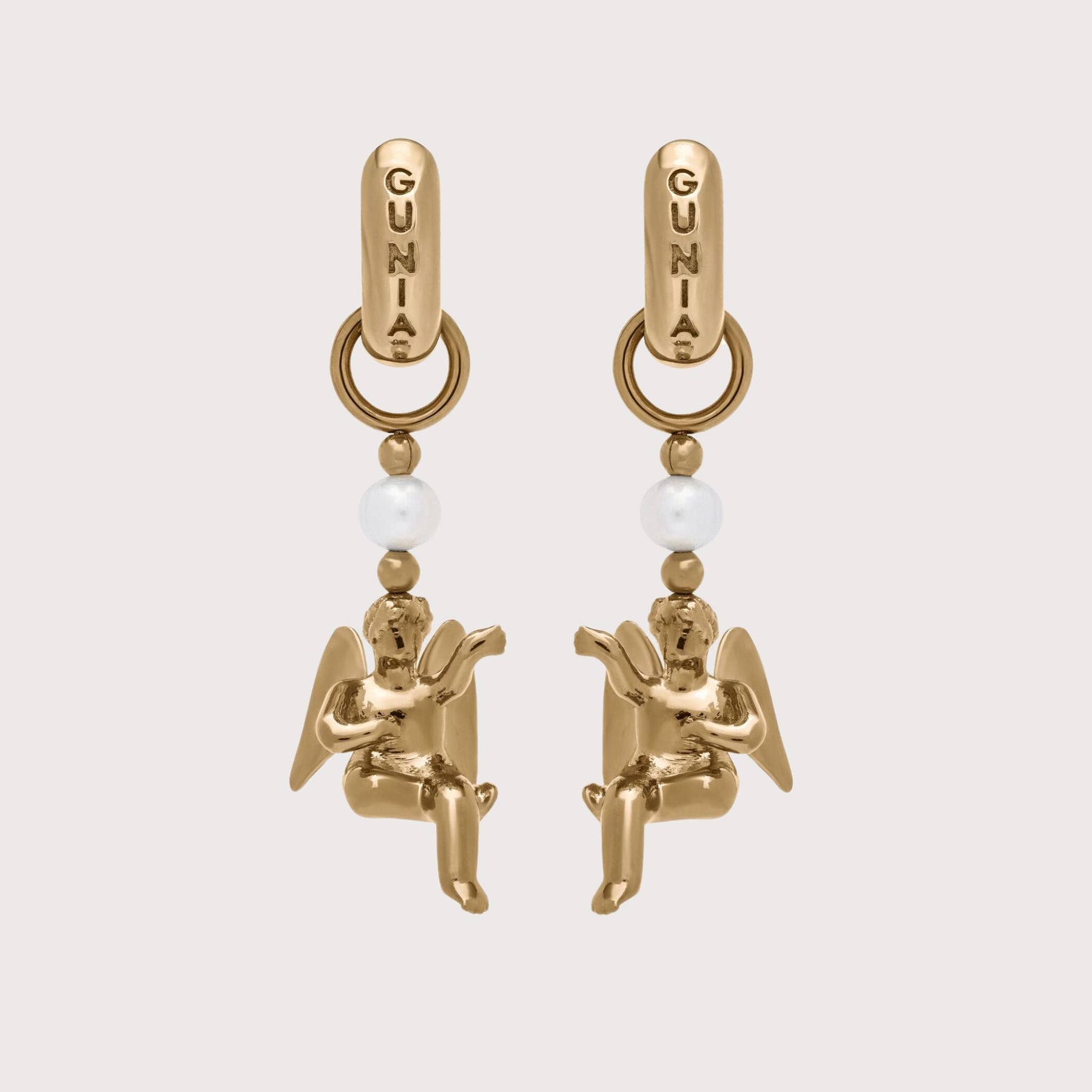 Earrings Angel - Pendants Set. The jewelry design is inspired by a naive embroidered rushnyk depicting an angel from the mid-20th century in the collection of the Ivan Honchar Museum. The set consists of two pendants that can be worn on a chain or on the hoop earrings provided. Transform the jewelry according to your mood; wear the set together or individually. Hand-crafted.