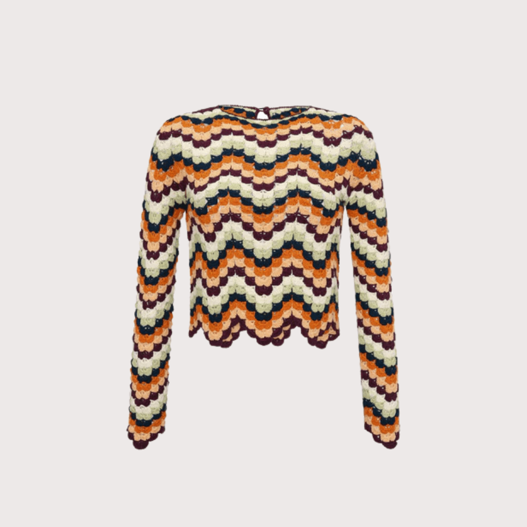 The Safi top is a fitted crop top with a crew neck. Made in a collaboration with expert knitters, each top and skirt is crafted by only one person, ensuring that the hand and crocheting style is absolutely even. The palette is the basis for the DEL NORTE collection, a mixture of earthy tones wit blues and sunset oranges and reds.