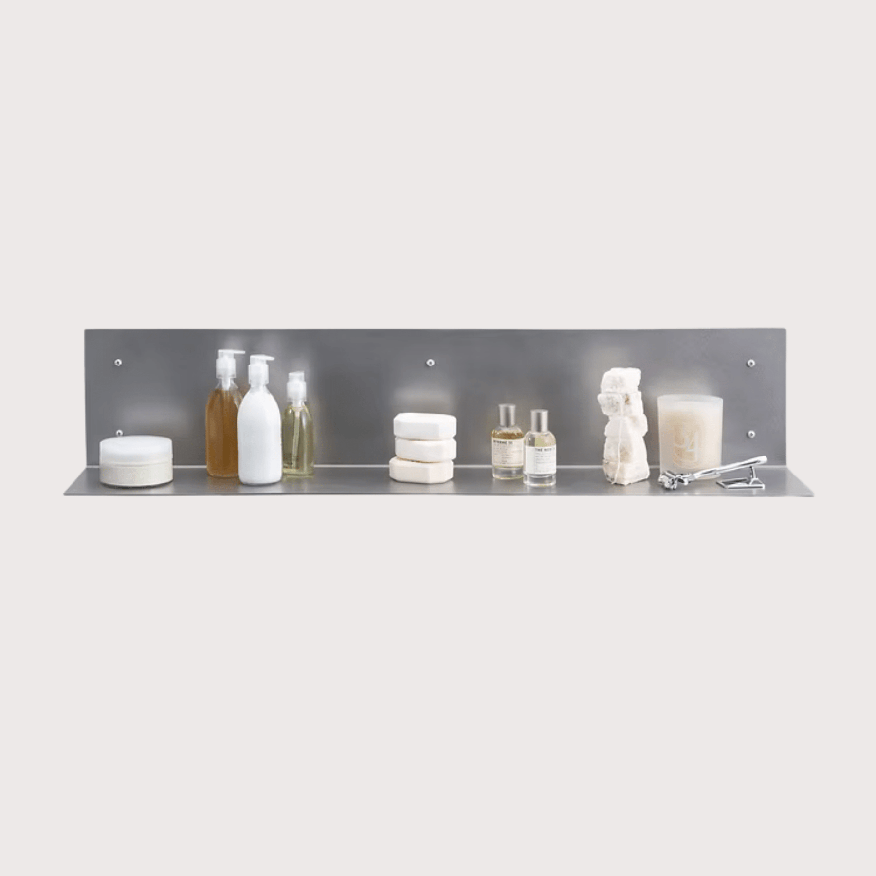 The Flora Shelf by Stainless Studios Berlin is a sleek, wall-mounted storage solution crafted from solid stainless steel with a subtle, patinated texture that masks fingerprints and minor scratches. Designed in Berlin and made in Germany, it features a minimalist form that blends storage and display—ideal for books, kitchenware, toiletries, or cherished collectibles.
