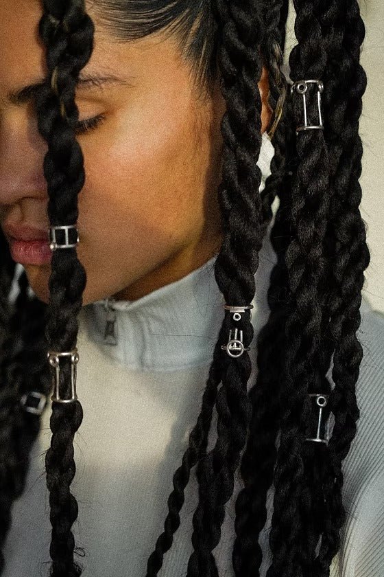 "THREE  PILLARS", "MOVING IN CIRCLES" and "THIRD EYE" are unique pieces that will elevate any look. From braids and locs to adorning your cornrows, the styling possibilities are limitless!
