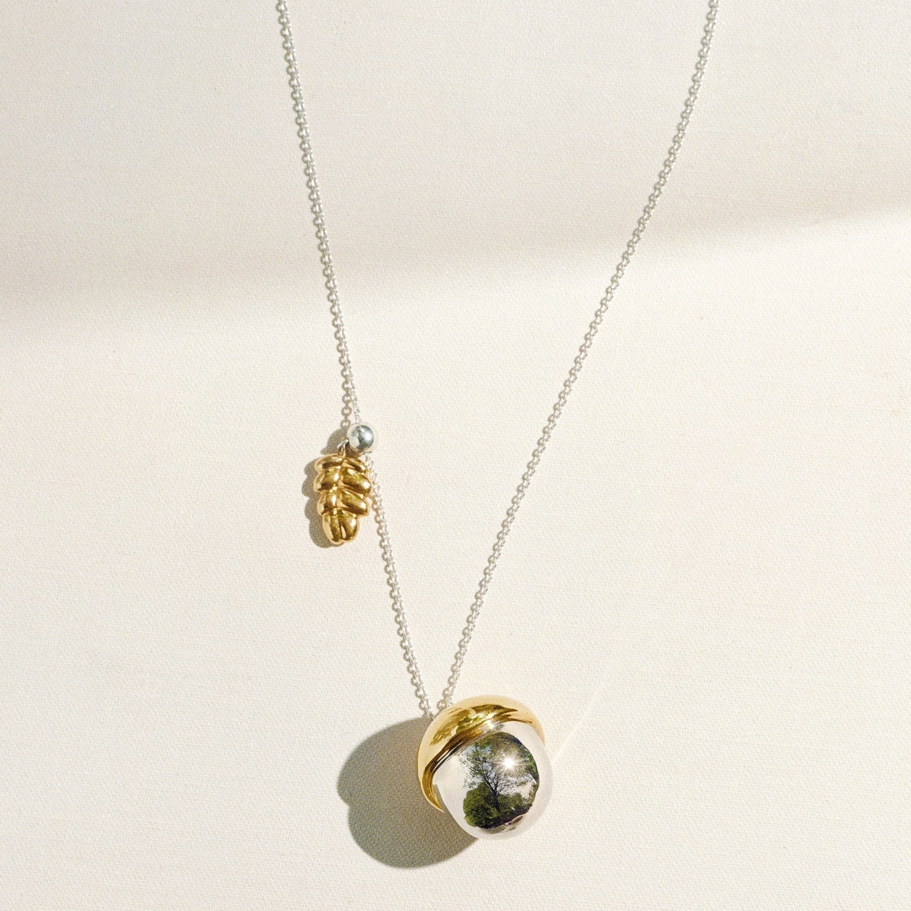 A silver chain with a contrasting golden leaf and an acorn pendant. The acorn motif is inspired by the Scythian jewelry discovered in the mounds of the Kherson steppes. In the Ukrainian tradition, the oak tree symbolized might and wisdom, and was used in games and rituals. Handcrafted.