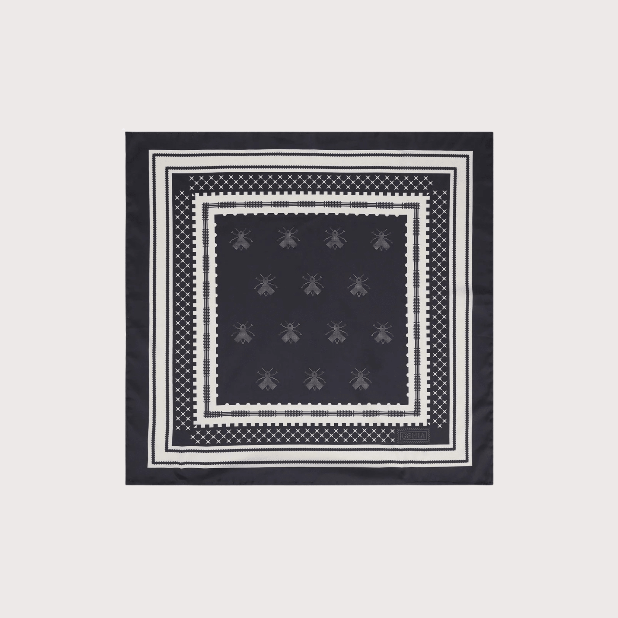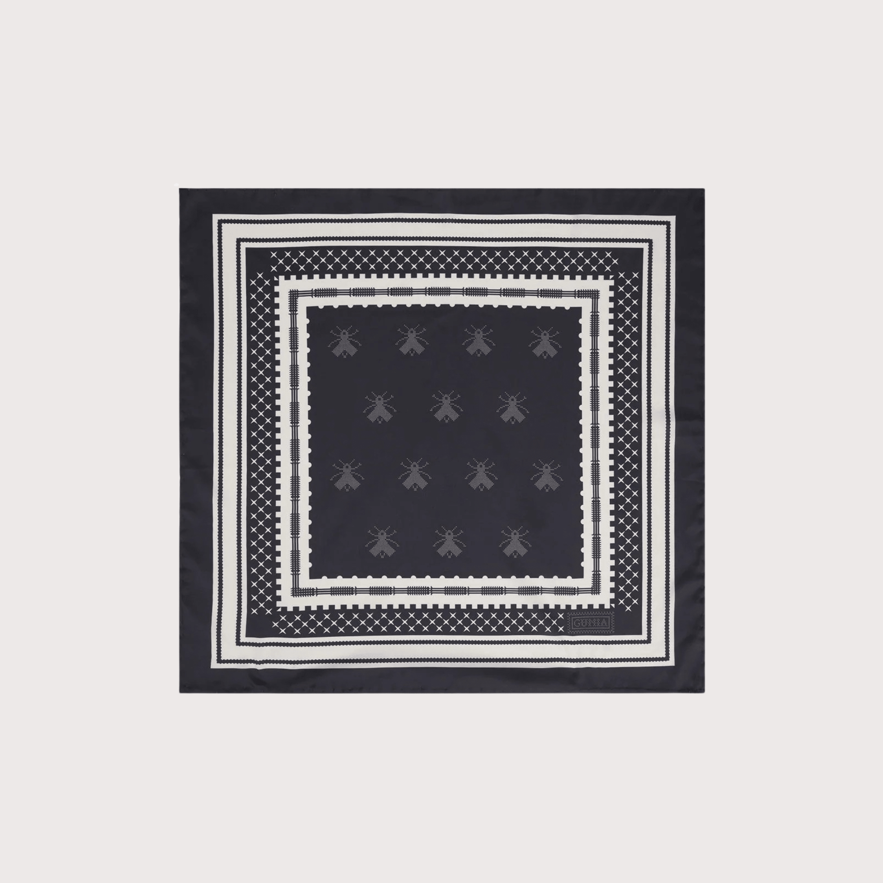 Bee Silk Headscarf in Black. The designer print reinterprets Ukrainian traditions of weaving, geometric ornamentation, and cross-stitch embroidery. The bee motif is inspired by the embroidered work of an unknown artist, discovered through original research by the Old Khata Project. Use it as a versatile accessory for the city or travel, keep it as a collectible object, or gift it to those who cherish the beauty of the authentic.