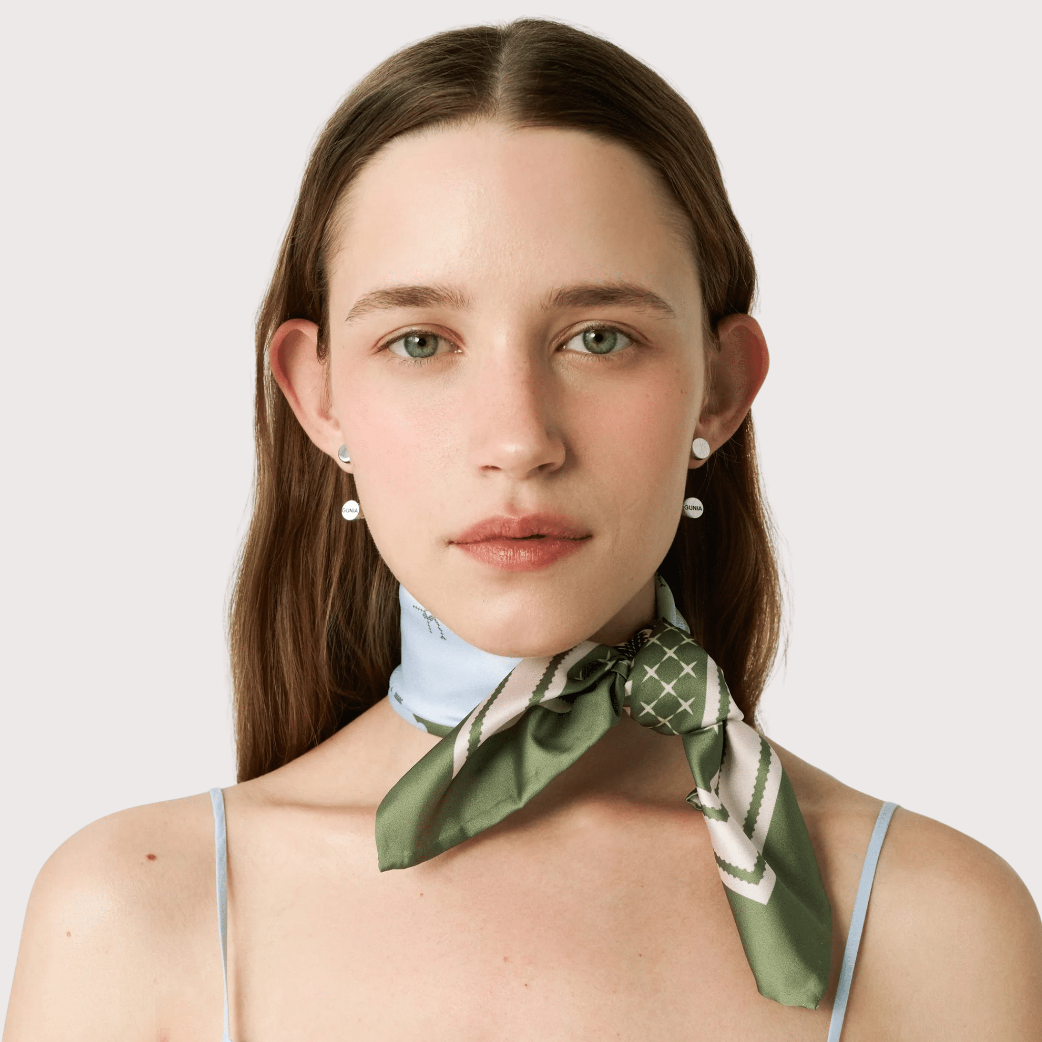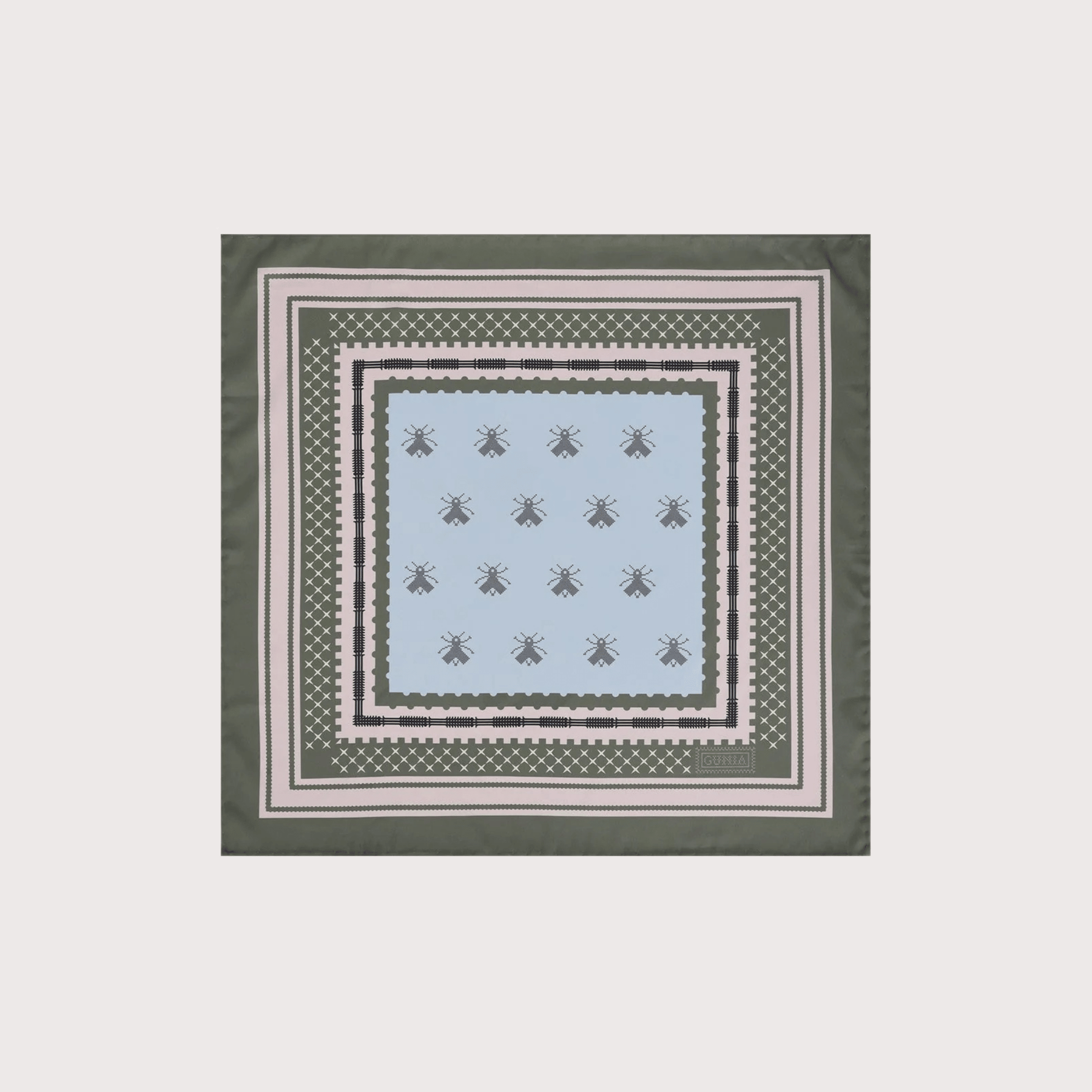 Bee Silk Headscarf in Green. The designer print reinterprets Ukrainian traditions of weaving, geometric ornamentation, and cross-stitch embroidery. The bee motif is inspired by the embroidered work of an unknown artist, discovered through original research by the Old Khata Project. Use it as a statement accessory for the city or travel, keep it as a collectible object, or gift it to those who cherish the beauty of the authentic.