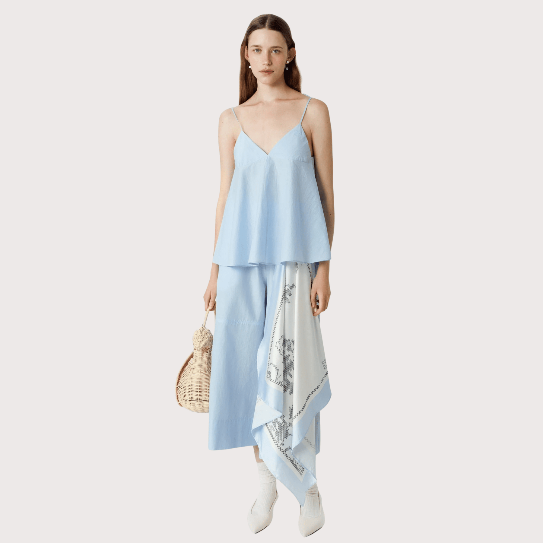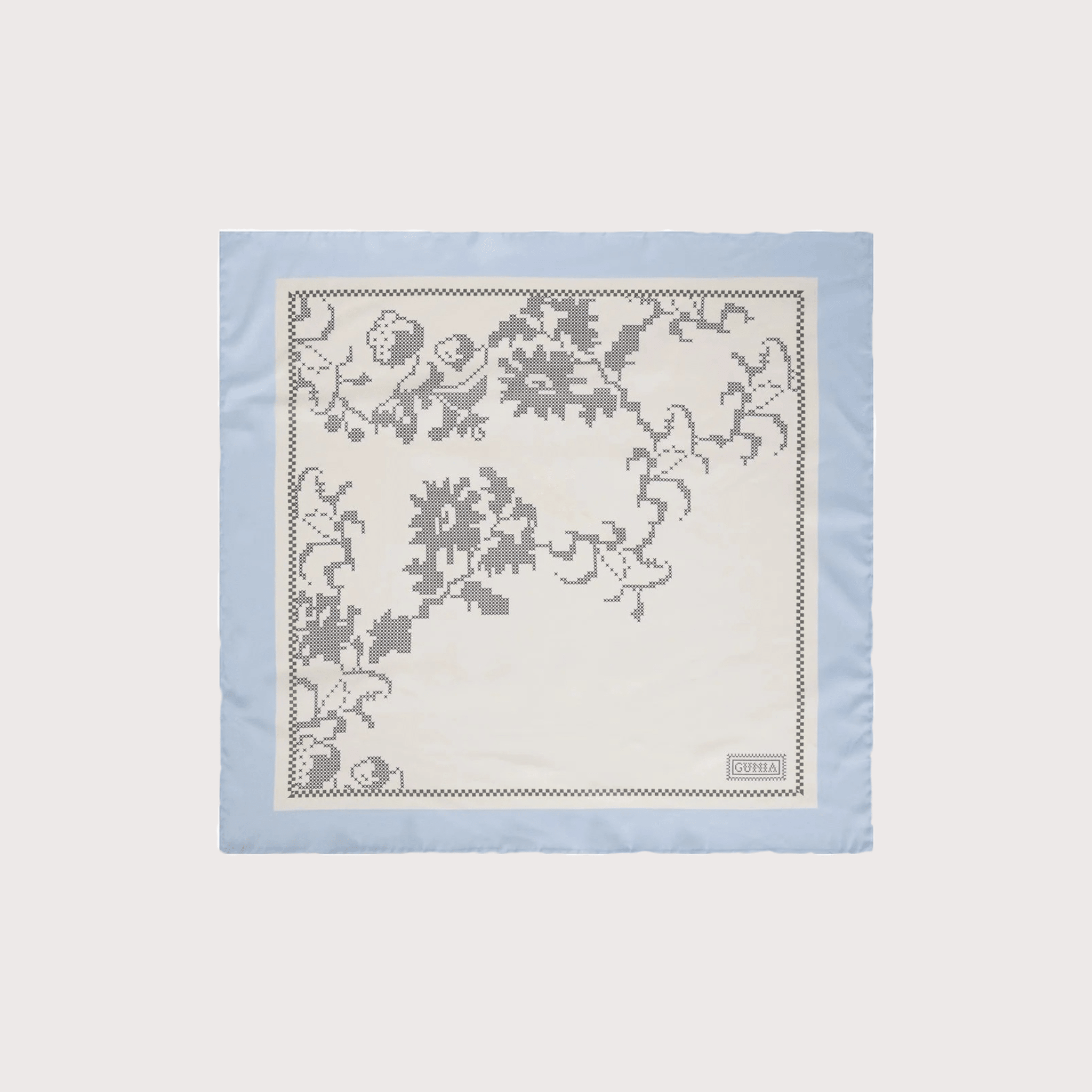 Flowers Headscarf. The designer print is developed based on a historic rushnyk from the GUNIA archive and the Ukrainian tradition of cross-stitch embroidery. Use it as a versatile accessory for the city or travel, keep it as a collectible object, or gift it to those who cherish the beauty of the authentic.