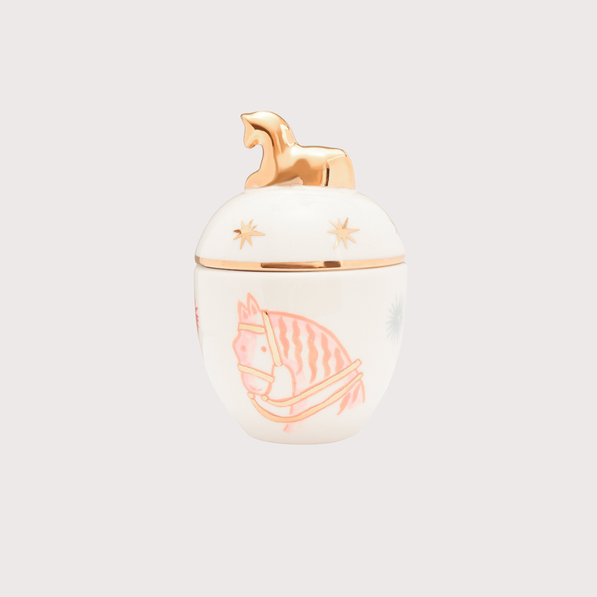 The painted design is inspired by naïve embroidered rushnyky and the optimism of a festive spirit, while the figurine on the lid follows the shape of an authentic wooden toy horse. Each sugar bowl is crafted and painted by hand, with glaze and gilding, ensuring the uniqueness of the ceramic item, support for artisans, and the preservation of tradition. This symbolic piece is meant to become a meaningful and touching gift, a cherished family keepsake, or simply a beloved holiday object.