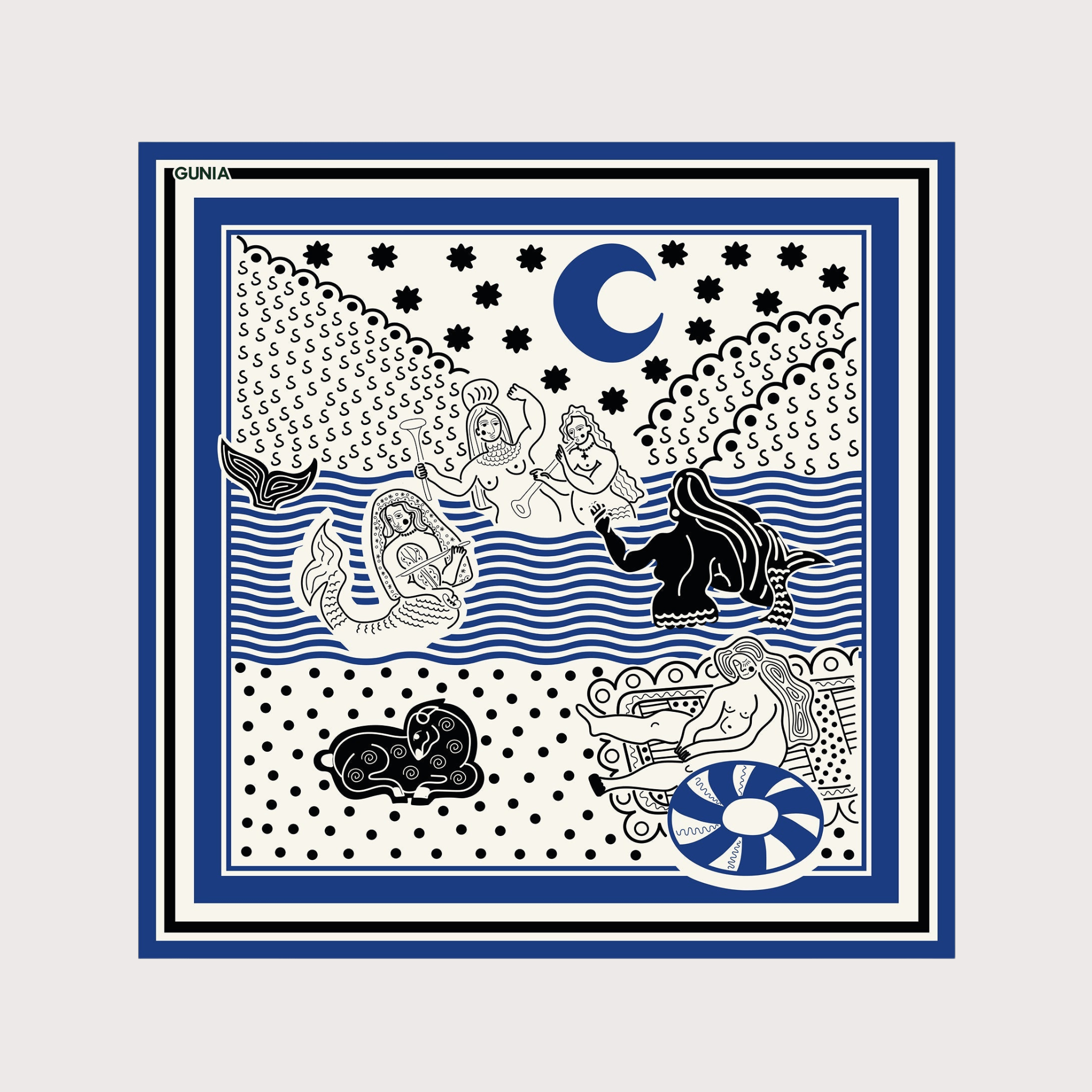 The print design with mermaids by the Vedmid-Hora Mountain is inspired by the 1695 intaglio ‘The Joy of the Dnipro Waters’ by Leontii Tarasevych. One of the mermaids is displaying the hand gesture of the Trident of Chornovil — a sign of resistance and unity.