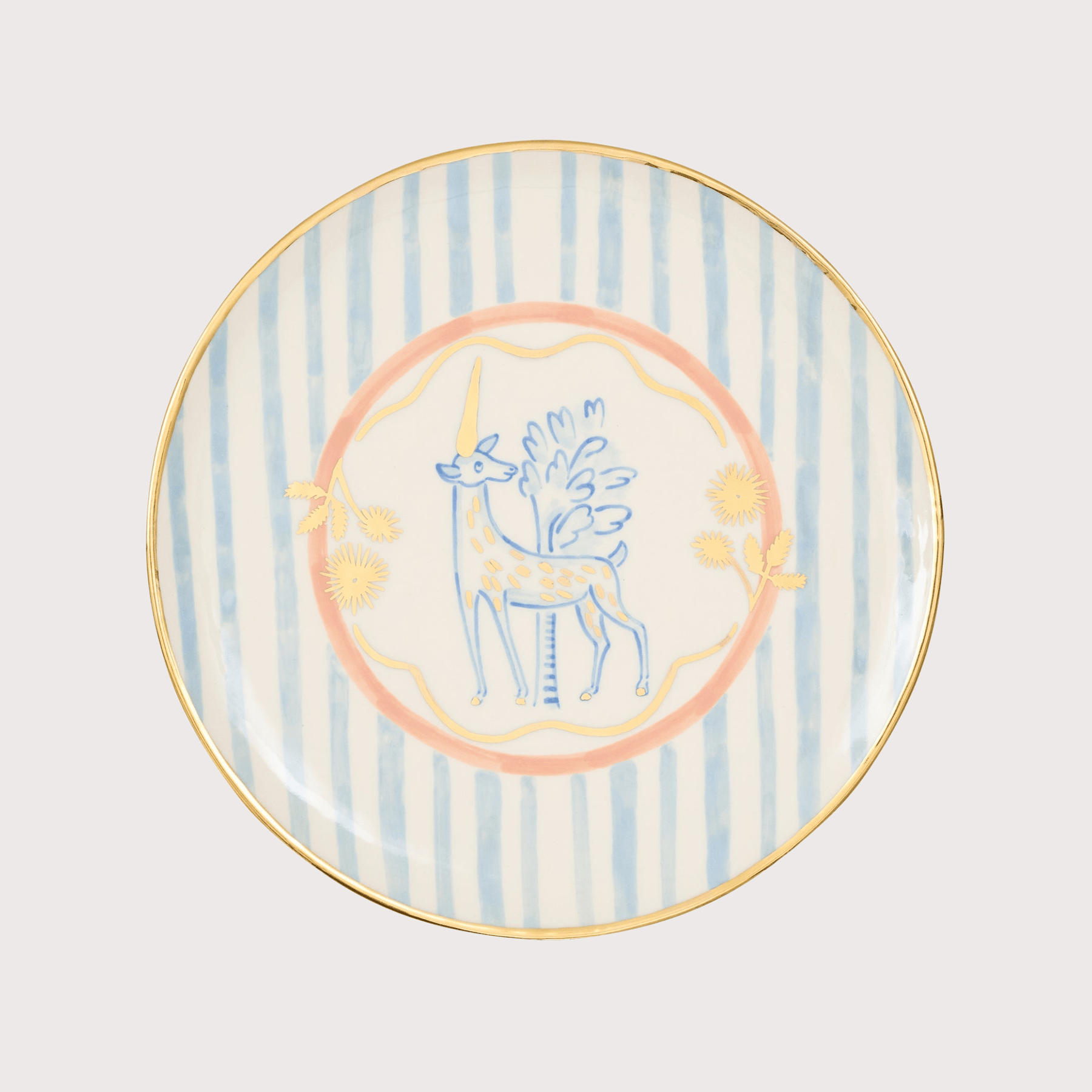 The design is inspired by a rare painted antique stove tile and motifs from naïve embroidered rushnyky. According to mythological beliefs, the unicorn brings happiness to everyone who encounters it. Each plate is crafted and painted by hand, with glaze and gilding, ensuring the uniqueness of the ceramic item, support for artisans, and the preservation of tradition. This symbolic piece is meant to become a meaningful and touching gift, a cherished family keepsake, or simply a beloved holiday object.