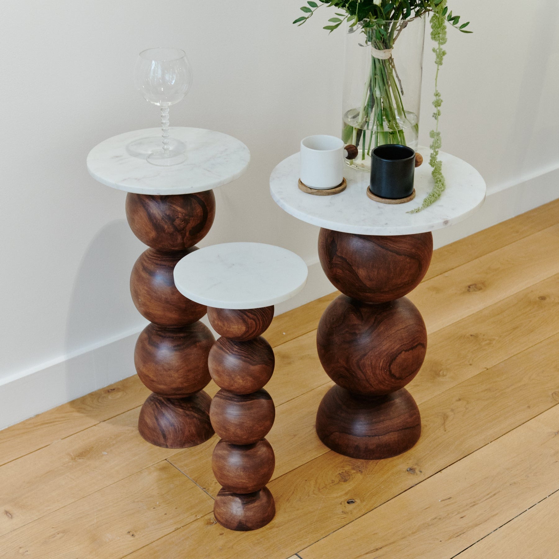 With its veined marble top and wooden legs, the Ball Pack Table, crafted from a single piece of wood, blurs the lines between sculpture and functionality. Ideal to keep a mug or cellphone next to a tight seating!