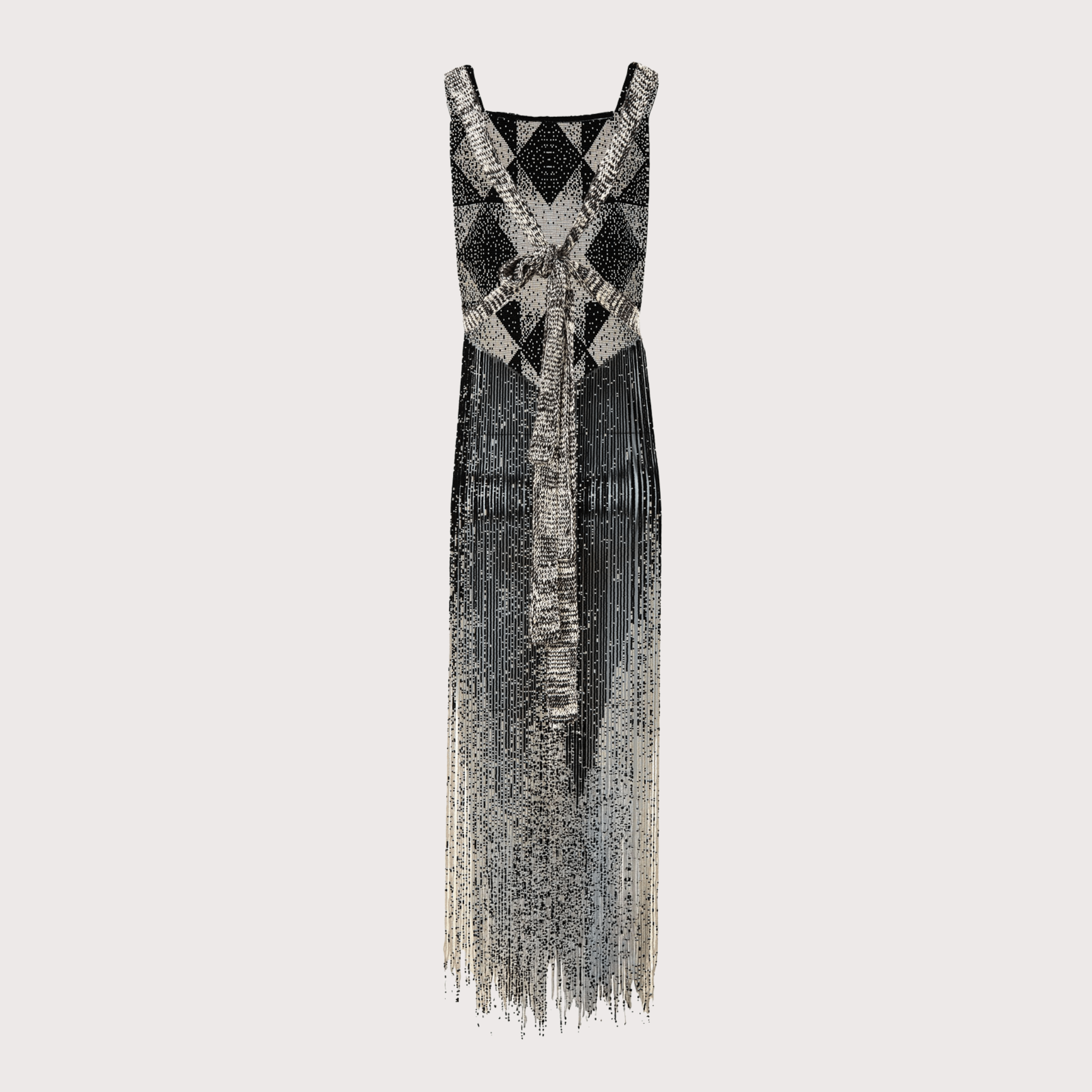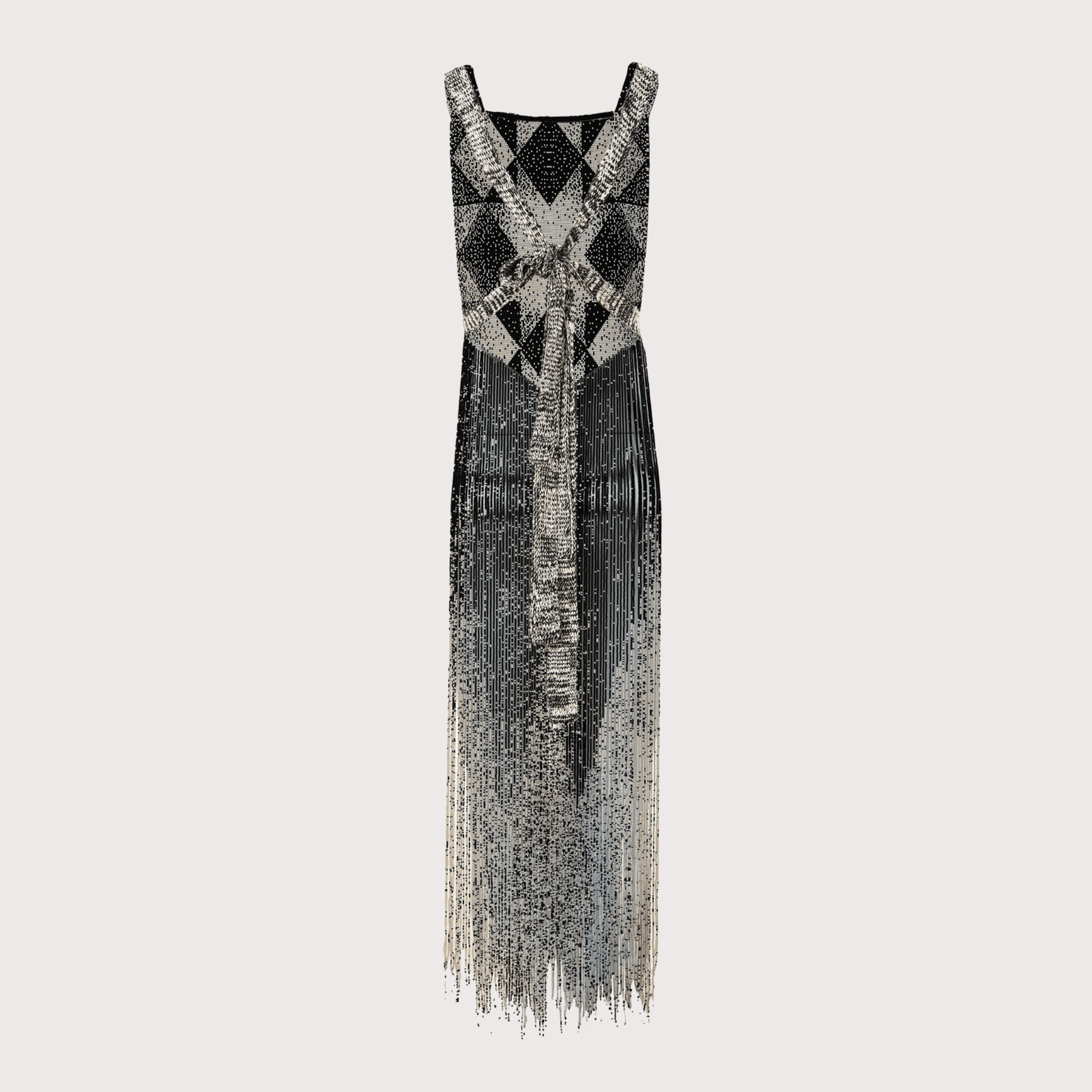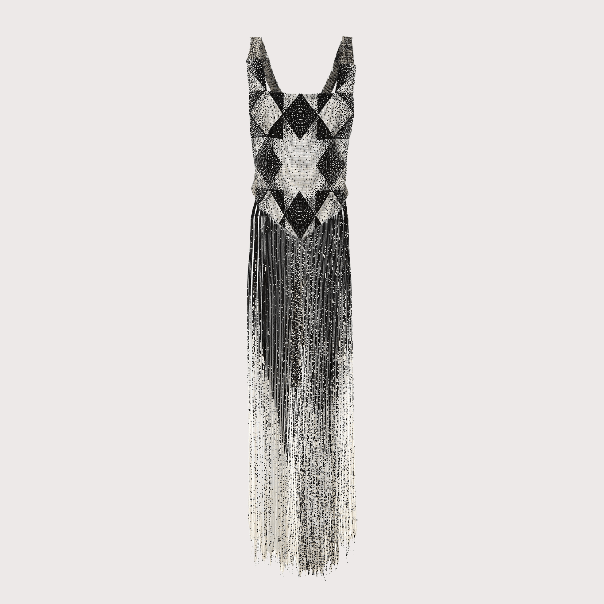 Chestpiece crafted in glass beadwork, composed of 20,000 glass beads with V-shaped fringes that fall to knee length. A highly detailed piece that adds drama, texture, and sophistication to any look