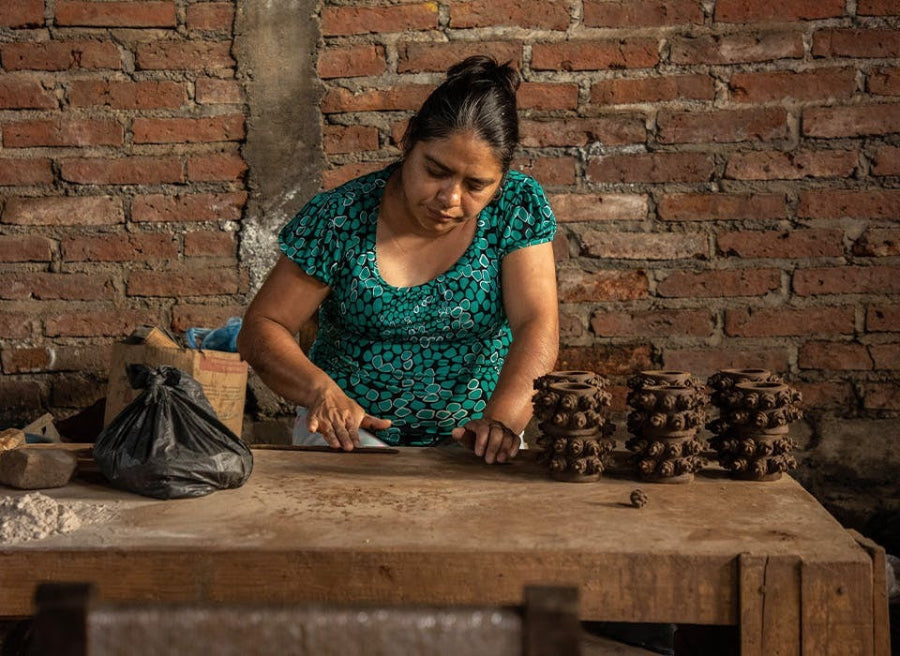 Onora Casa works primarily with two different types of pottery, pastillaje and Barro Negro. Pastillaje, typical of the Michoacán province, refers to a process where thin strips of clay are pinched between the fingertips to create ornamental petals, scales, and spines. This distinctive technique can be used to make designs that resemble flowers and the spikes of their iconic pineapples. Barro Negro, the traditional Oaxaca black clay, is found in the San Bartolo Coyotepec region has been used since Mesoamerican times. Currently, around 600 families in and around San Bartolo Coyotepec are dedicated to producing utilitarian and decorative objects using Barro Negro.