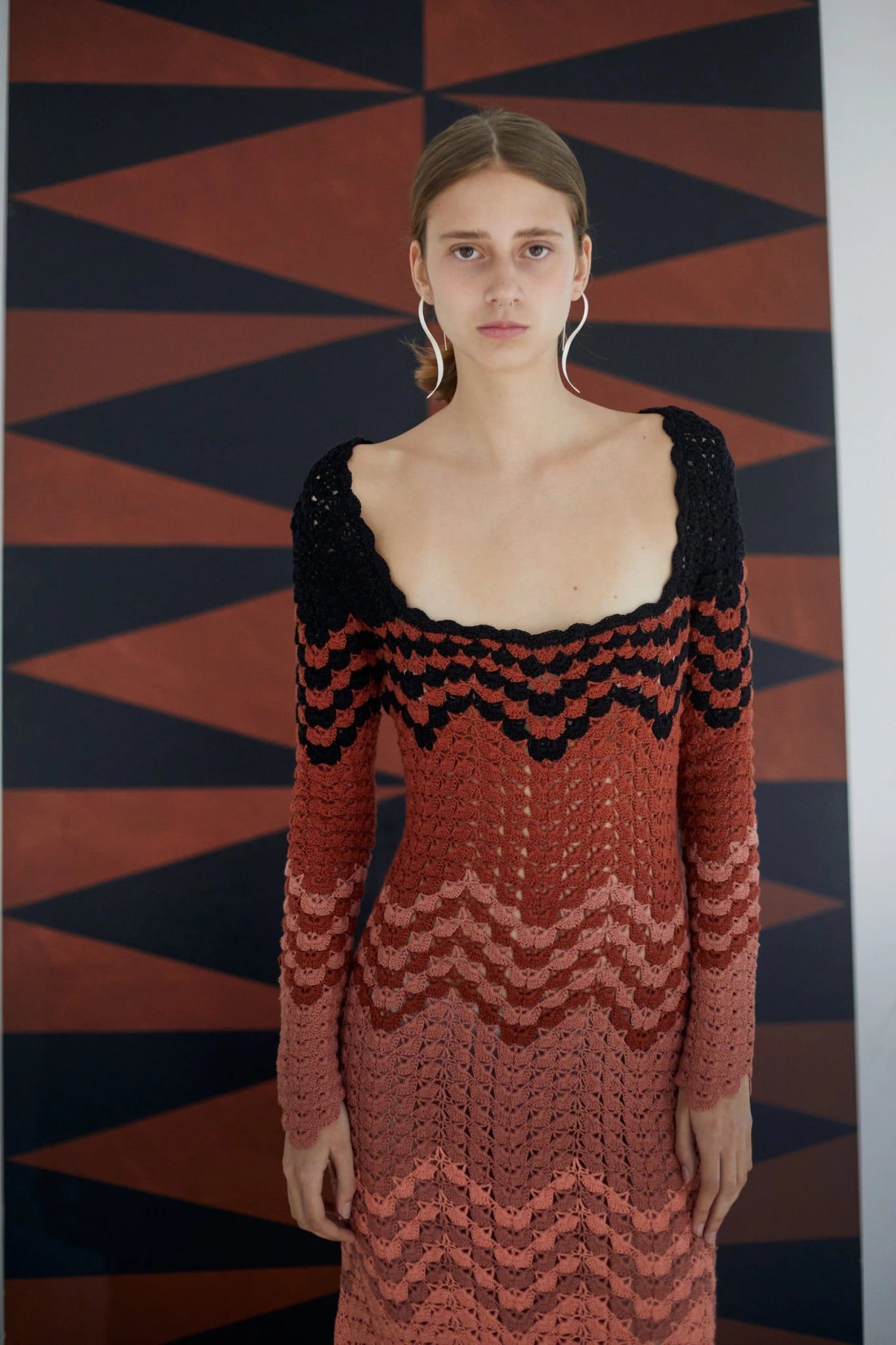 This hand crocheted long-sleeve maxi dress is a classic ESCVDO silhouette made with the signature ABANICO stitch. The SUMAC plays with the color palette that defines DEL NORTE as a collection, all designed at the ESCVDO Studio. Each dress takes the knitters over two weeks of full crochet immersion, and it is made by only one person, so the hand and crocheting style is absolutely even.