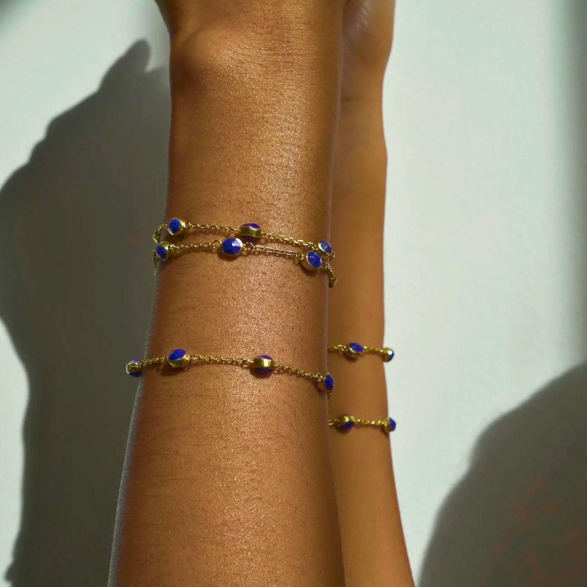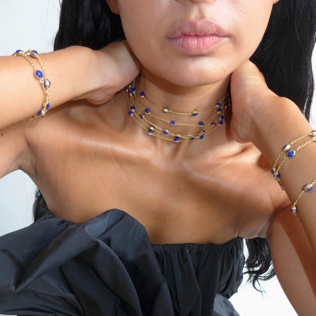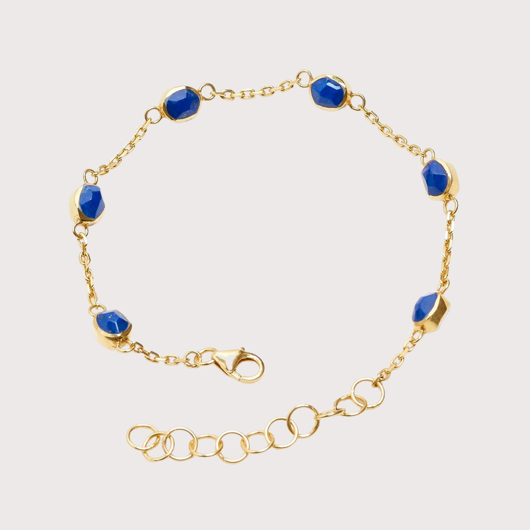 The Sina Bracelet catches the eye with its round lapis lazuli elements organically cut on both sides. The dainty chains are made of high-quality .925 silver in a goldsmith’s workshop in Kabul and gold-plated locally on-site.