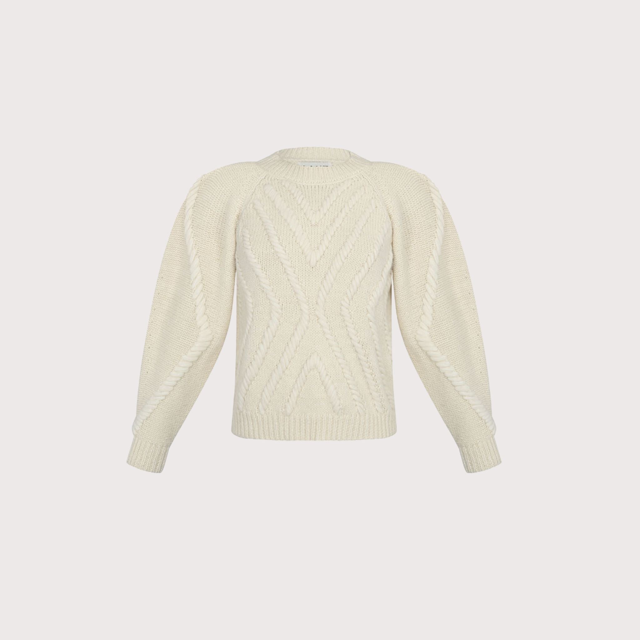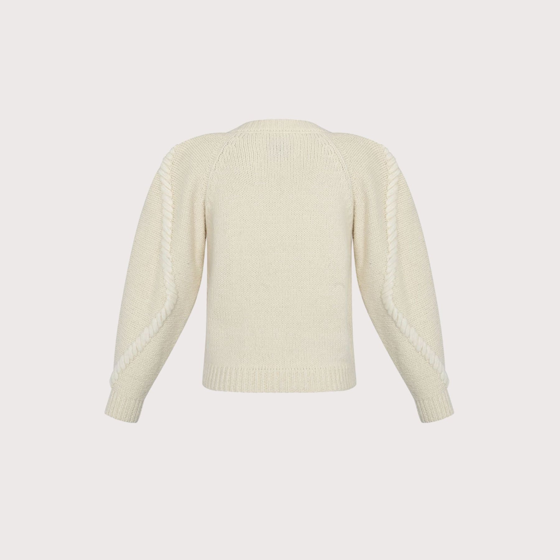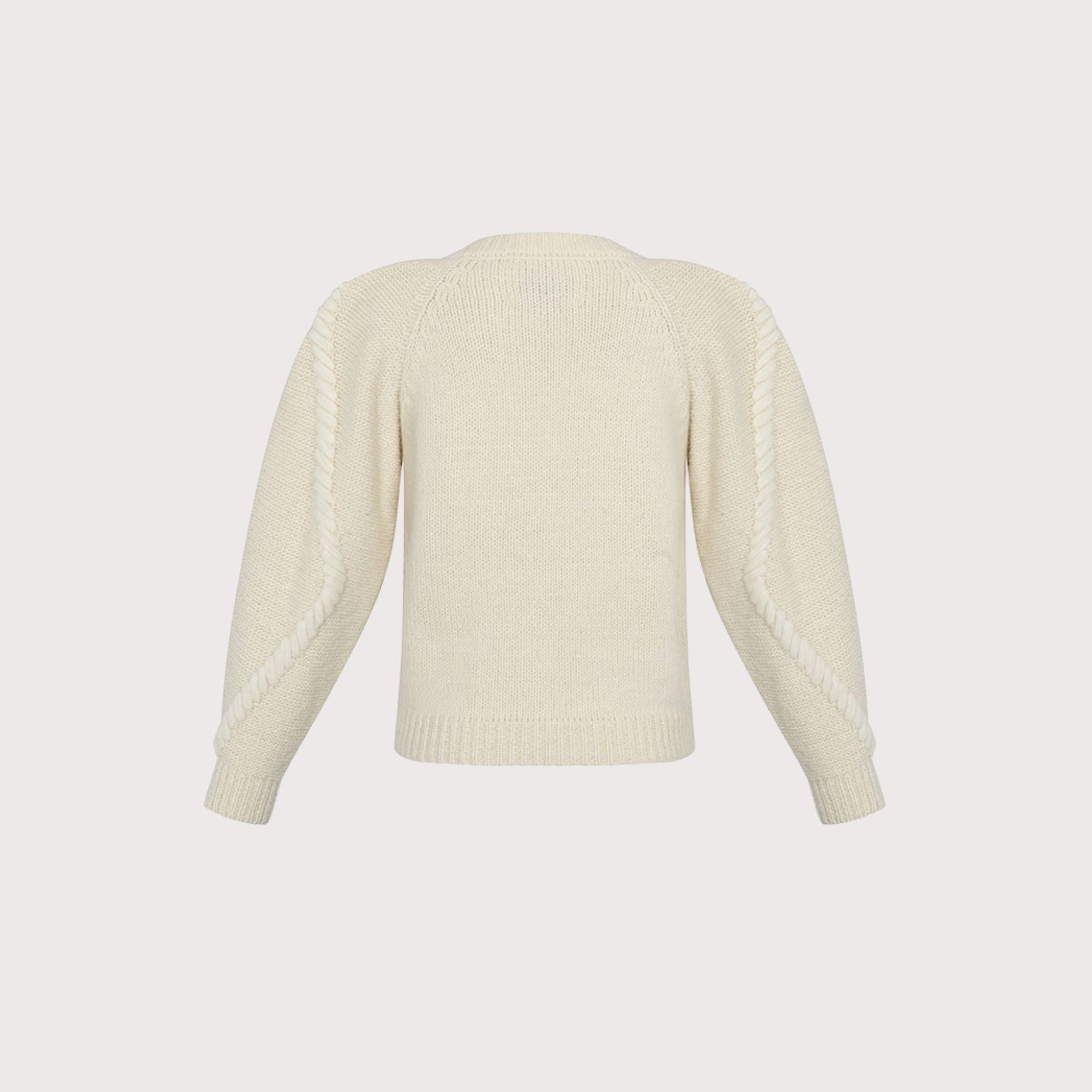 Introducing the Alpamayo Sweater, with dramatic, voluminous sleeves, a versatile piece crafted from a blend of alpaca and Pima cotton yarns, ensuring a soft texture to the touch. It features hand embroidery, which adds an unrivaled texture to the garment.