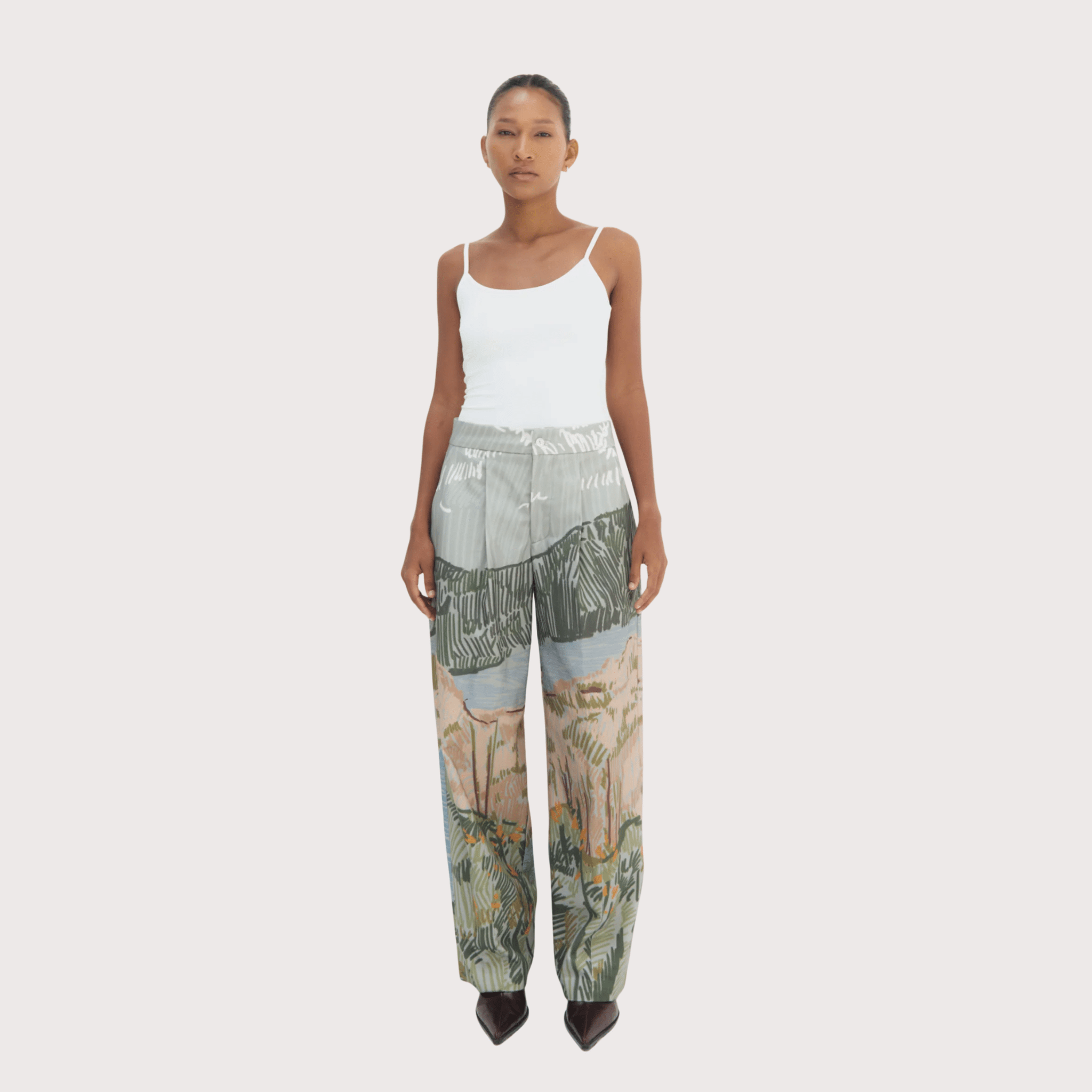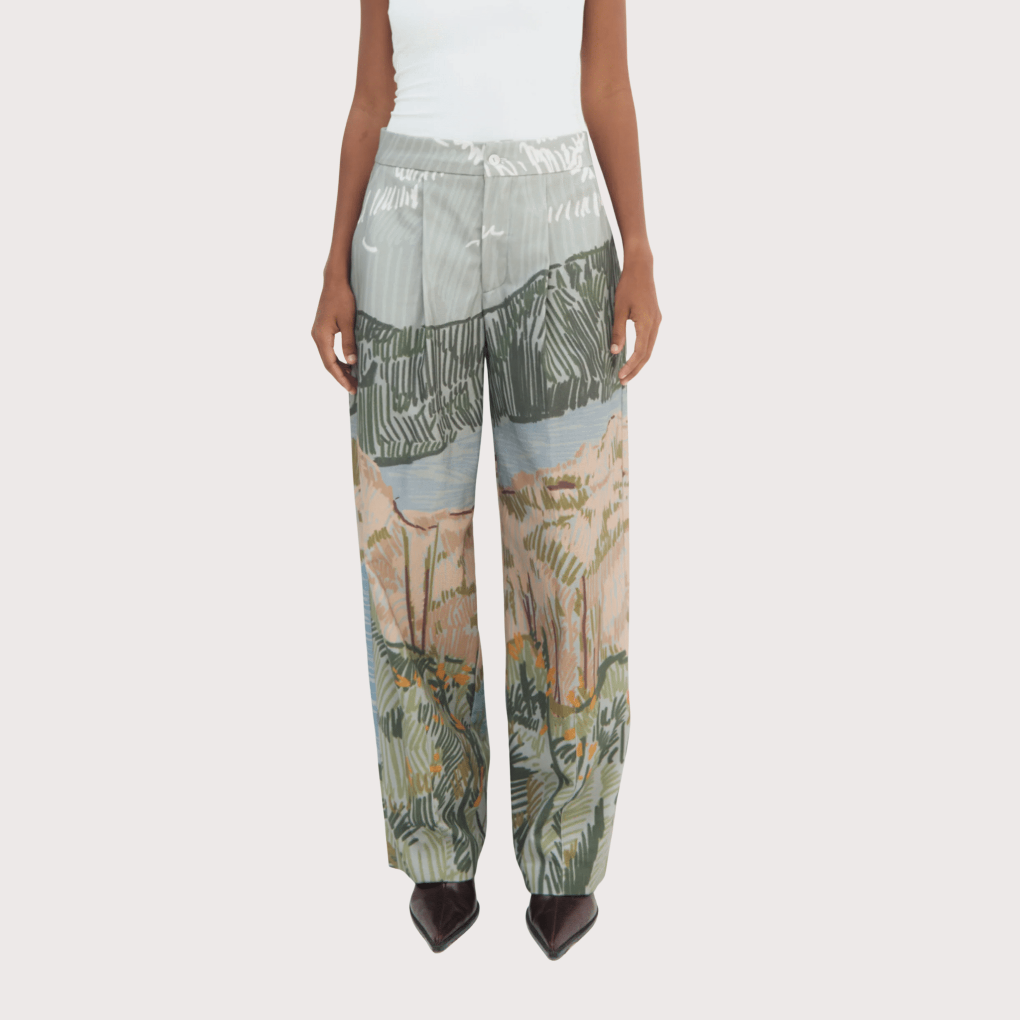 The Bruma Curved Trousers are made from soft cotton and feature a curved-leg design for a modern shape. Printed with an abstract Andean landscape, they offer a comfortable fit with a distinctive look. Easy to style and ideal for everyday wear.