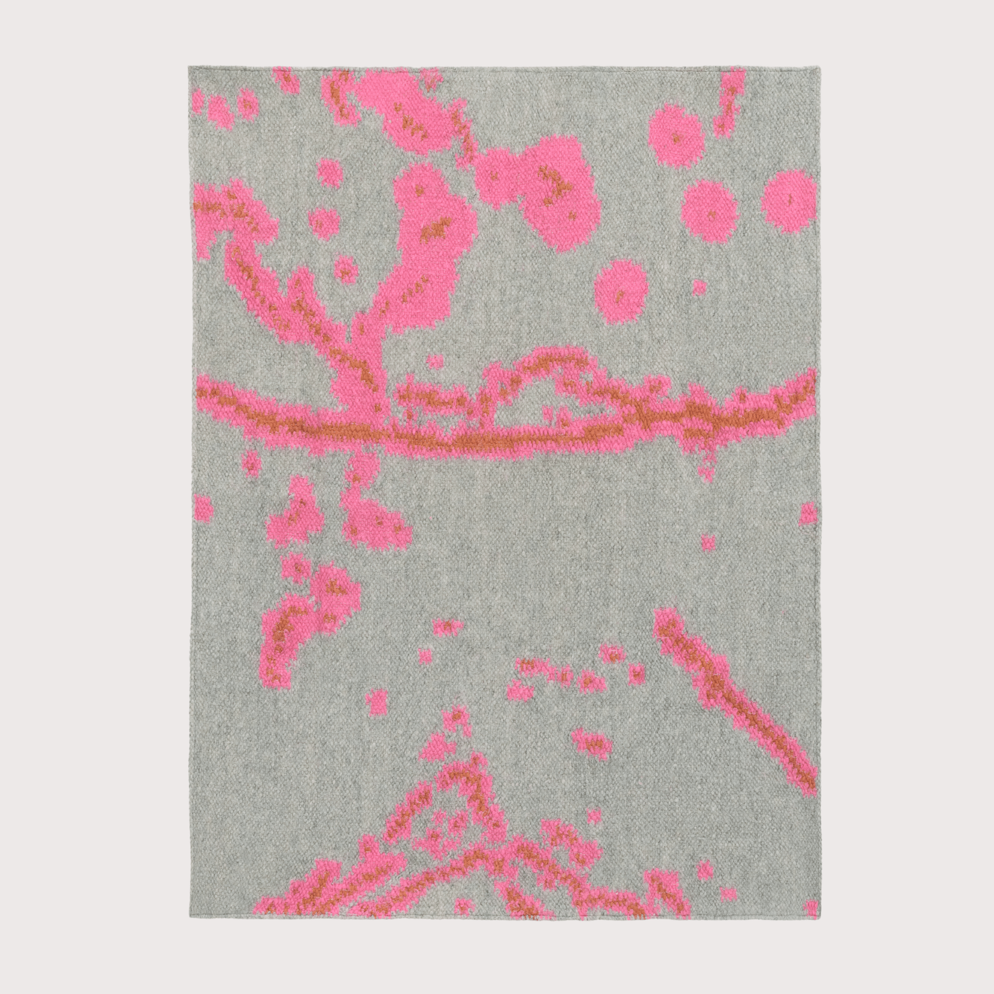 The slow bloom of mold on fruit and the raw quiet of clumped space dust. Bright pink glitches across a muted gray field — a handwoven study of surfaces abandoned, shifted, or simply left to change.