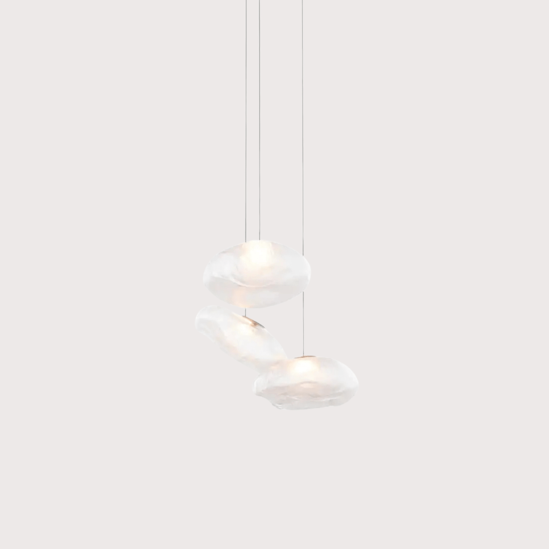 73.3 is composed of three glass pendants, which are hand blown into a folded and highly heat-resistant ceramic fabric vessel and attached to a single canopy.