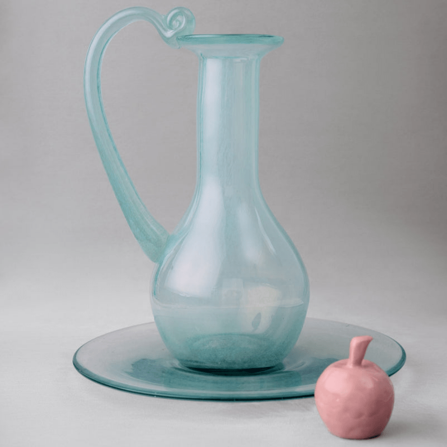 Nadiia x YaKUSH created a design of a water set in a pale azure color inspired by Ukrainian apple and pear orchards. The set includes a glass pitcher, two glasses, a plate and a ceramic cork in the shape of an apple or a pear.